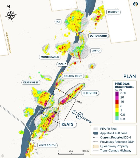 Figure 1: Plan view map of the AFZ Core with location of Keats and Iceberg excavation grade control drill programs.