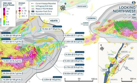Figure 2: Keats and Iceberg excavations with proposed grade control drill holes and location of results received.