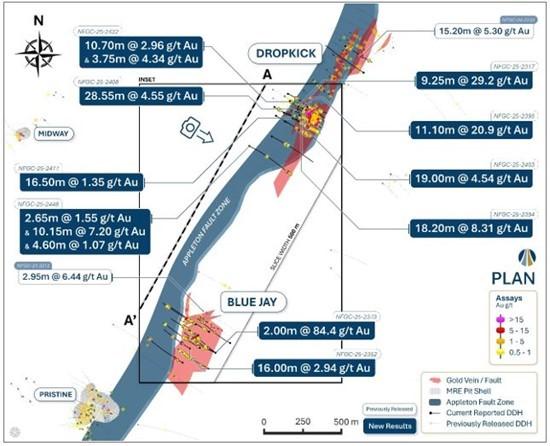 Melissa Render, President of New Found Gold stated: “In late 2024, we made a high-grade discovery at Dropkick in the AFZ Peripheral area at Queensway. Initial 2025 drill results have expanded the mineralized footprint at Dropkick to 815 m along strike and to a depth of 285 m. Importantly, the zone remains open along strike and to depth. New results confirm the presence of high-grade mineralization and current exploration is focused on its expansion.