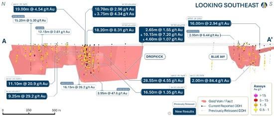 These intercepts occur in the southwest extent of the Dropkick fault zone in a domain of high-grade mineralization discovered in Q4/24. Continued exploration drilling in 2025 has successfully extended the high-grade mineralization from surface to a vertical depth of 285 m and across a strike length of 75 m (Figures 2 and 3). Ongoing step-out drilling both on the northern and southern boundaries has expanded mineralization associated with the Dropkick fault zone across a strike length of 815 m.