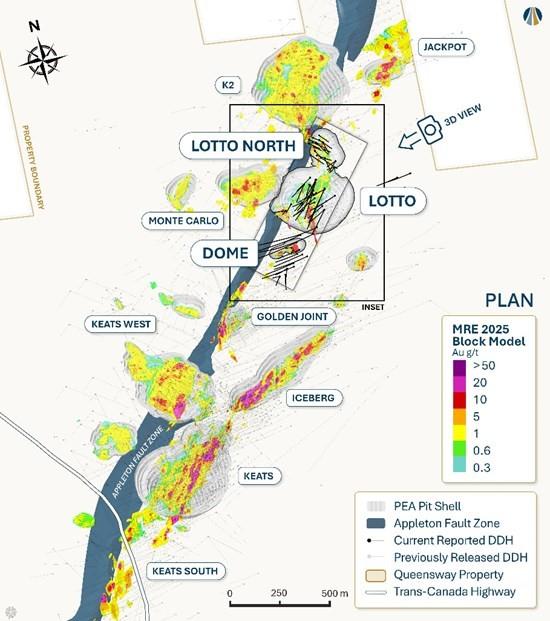 Melissa Render, President of New Found Gold, stated: “These new results from our Dome step-out program, where we have hit high-grade gold mineralization over broad widths, demonstrate the potential for resource expansion within the footprint of the PEA mine plan in the AFZ Core at Queensway. The infill results from Lotto and Lotto North reported today focus on resource conversion and are consistent with past results. All results from the 2025 drill program will be incorporated into a Queensway mineral resource update currently scheduled for H1/26.”