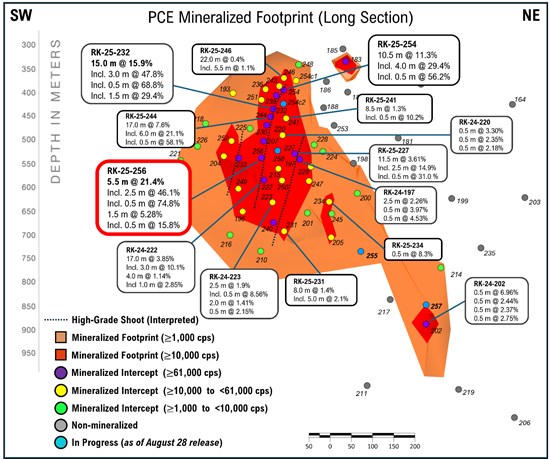 Significantly, this high-grade uranium intersection in RK-25-256 is 119 m down-dip of drill hole RK-25-232, and an additional 51 m down-dip of recently reported (see news release dated November 12, 2025) RK-25-254 (Figure 1 and 3). Overall, intense high-grade uranium mineralization is currently interpreted along a minimum of 215 m of dip extent from RK-25-254 to RK-24-222.