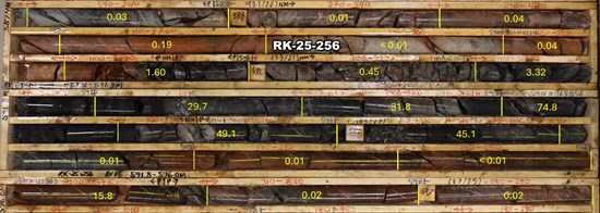 Figure 2: Core photo with select assays from RK-25-256, grades are shown as % U3O8