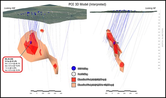 Figure 3: Interpreted 3D model of PCE shown looking northwest (across strike) and northeast (along strike); previously reported in August 28 release, now with RK-25-256 intersection shown as purple outline for reference