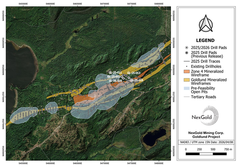 NexGold Mining Corp. (TSX-V: NEXG) (OTCQX: NXGCF) is pleased to provide additional results from the ongoing diamond drilling program at the Company’s Goliath Gold Complex, which includes the Goliath, Goldlund, and Miller Deposits (see NexGold news release dated January 28, 2026). The drill program, which comprises up to 25,000 metres, is focused on the Goldlund Deposit, with holes designed to infill and potentially expand open pit Mineral Resources. The results presented in this news release include 777 metres of diamond drilling in three drill holes (GL-25-015, GL-25-016, and GL-26-009) that infill and expand mineralization in Zone 4 of the Goldlund Deposit and specifically within Inferred Resources located at the northeast end of the open pit Mineral Resource (Figures 1 and 2; Tables 1 and 2).