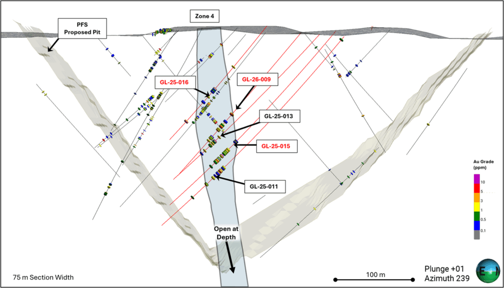 Drill holes designed throughout this program have been distributed across the strike of Zone 4 with GL-25-015, GL-25-016, and GL-26-009 located toward the northeast end of the zone. These new holes are near previously reported drill holes GL-25-011 and GL-25-013, which intersected 2.31 g/t gold over 21.5 metres and 2.34 g/t gold over 10.2 metres, respectively (see NexGold news release dated February 25, 2026). Gold intersected in these holes further demonstrates the continuity of mineralization and the potential for resource expansion in Zone 4 as additional targets are drilled along strike and down dip.