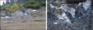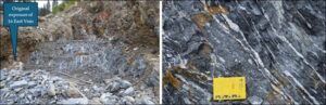 | Figure 2. Working faces of the bulk sample site – September 14, 2025. Total width of photo is 40m, distance between hanging wall (right side) of 16 Vein and Pit Vein is 20m. | Figure 3. Pit Vein system as exposed on the working face. |