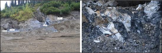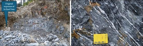 | Figure 4. 16 Vein (black with white stripes, is ~4m wide below axe) and 16 East Vein (white) | Figure 5. High-grade section of the upper portion of the 16 vein. |