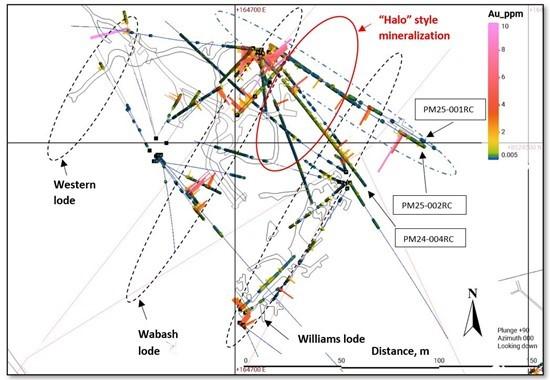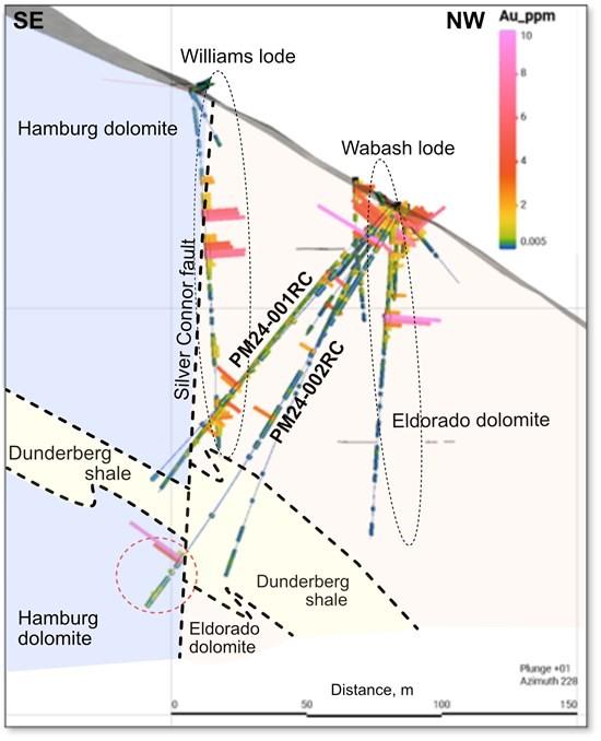 Area 1: Wabash/Williams extensions – PM25-001RC and 002RC were aimed at extending the previously unknown lower grade “halo” style mineralization encountered between the high-grade Wabash and Williams Lodes exemplified by PM24-04RC that intersected 126.5m (415ft) @ 1.06 g/t Au (previously announced 14th August 2024). Both holes successfully intercepted lower grade mineralization between the two lodes. The holes were collared on the Wabash lode and were drilled towards the Williams lode. The intersections in both holes were interrupted by a shaley unit suspected to be the Dunderberg shale, indicating fault complications (see Figure 2 for a possible interpretation). The holes extended the mineralization of both the Williams Lode, and the lower grade halo a further 30 m (98 ft) to the north.