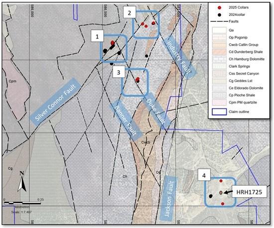 Figure 3. Geology map showing drill areas for 2025 campaign (numbered light blue boxes), and their geologic context. 1) Wabash/Williams, 2) Industry Tunnel, 3) Dean Cave, 4) Lower Prospect Mountain East (LPME).