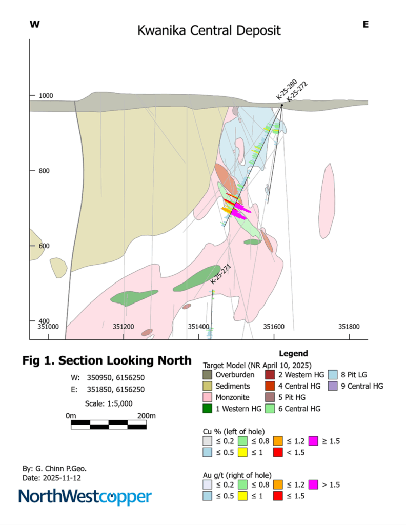 NorthWest Copper Corp. (TSX-V: NWST) is pleased to announce standout assay results from the fourth drill hole of its 2025 drilling program at the Company’s 100% owned Kwanika project in British Columbia. Drill hole K-25-280 successfully intersected both the Pit and Central copper-gold zones, highlighted by an exceptional intercept of 36 metres grading 0.80 % Cu, 3.21 g/t Au (3.67% copper equivalent1, “CuEq”) in the Central Zone. This drill hole returned results that exceeded expectations in both grade and thickness.