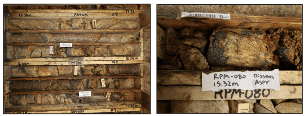The latest diamond core drill results continue to increase resource confidence at RPM North, as well as adding new resource potential to the east. Holes RPM-068, RPM-070, and RPM-080 all intersected approximately 20m or so of granodiorite before transitioning to hornfels predominantly for the remainder. Mineralization occurs within sheeted to stockwork quartz and quartz-tourmaline veins. A large portion of these holes exhibited moderate to strong fractures with clay gouge and healed brecciated zones. These fractured zones contain moderate to strong argillic alteration. Hole RPM-080 had a high-grade intersection of 19.7 g/t Au from 15.2m to 17.6m, which can be attributed to the patchy and disseminated arsenpyrite shown in the two photos below.