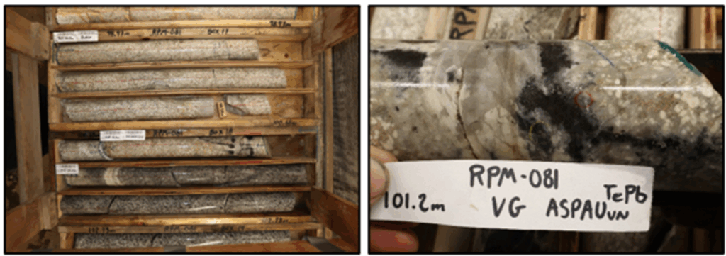 Figure 2. RPM Valley hole RPM-081 0.5m @ 364.0 g/t Au at 101m, with visible gold observed in the assayed core