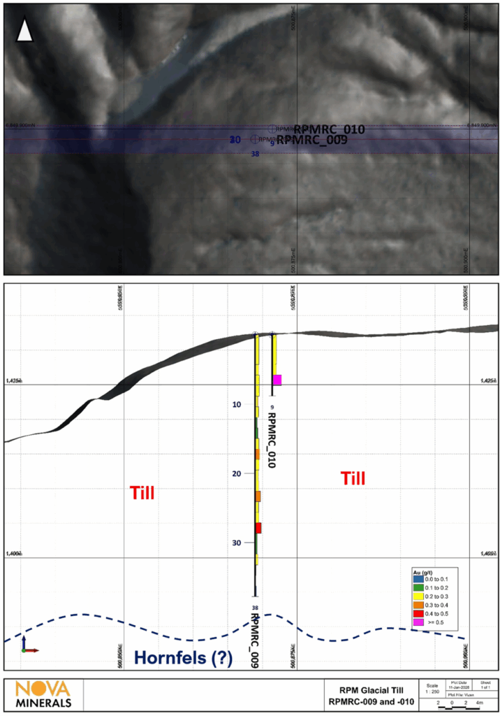 • 10 RC holes were completed in the RPM glacial till using Nova’s in-house rig as a preliminary, cost-effective test, returning a notable intercept of 33 m @ 0.3 g/t Au from surface (RPMRC-009). Results indicate the essentially drilled and blasted till material may be at least 30m thick over ~330,000 m², and this area remains a high-priority target, with future work to focus on improved sampling methods and thickness verification (Table 3 and Figure 8).