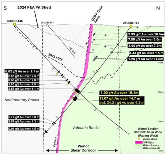Holes 25ODD-142 and 25ODD-146 were drilled on East Wenot in an area more sparsely explored. The primary objective was to test continuity of the mineralized zones previously intersected in 22ODD-046 (50m to the west), in order to extend mineralization in this area. Hole 142 was drilled from the north and intersected a couple of minor gold zones within the volcanics, including 1.01 g/t Au over 1.5m and 4.43 g/t Au over 1.5m. However, within the Dike Corridor, a very significant high-grade gold zone grading 11.07 g/t Au over 14.7m was intersected mostly within a hematitized “red” felsic dike, at an approximate vertical depth of -210m. This red felsic dike is almost merged with the CQFP in this area. Further downhole, a series of narrow mineralized intercepts within the sediments, included 0.77 g/t Au over 3.0m, 1.88 g/t Au over 1.3m and 0.91 g/t Au over 4.5m.