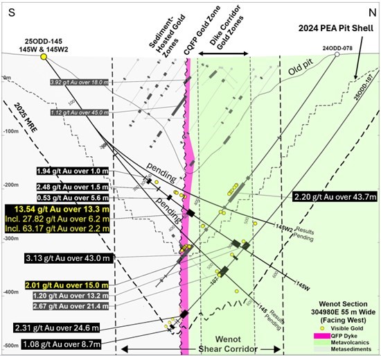 25ODD-145w is one of three holes drilled from the south on a single section line (304980E) in the central Wenot area. A first Hole 145 was followed with a wedged hole (145w) and a second wedged hole (145w2). Results have only been received for Hole 145w with results pending for adjacent holes 145 and 145w2. As usual, multiple gold zones were intersected. The CQFP and adjacent altered diorite dikes returned an impressive 13.54 g/t Au over 13.3m, which included 27.82 g/t Au over 6.2m.