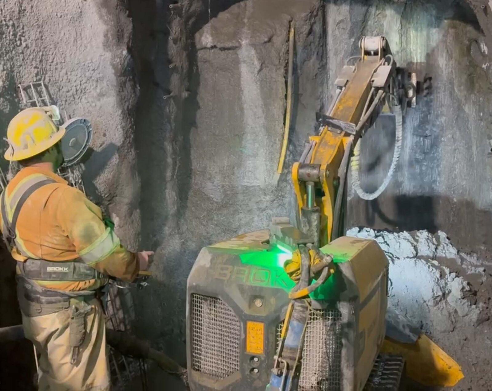 Brokk Electric Demolition Robot – pictured here fitted with a drum cutter head, cutting into the crosscut face. (video available on website link above)