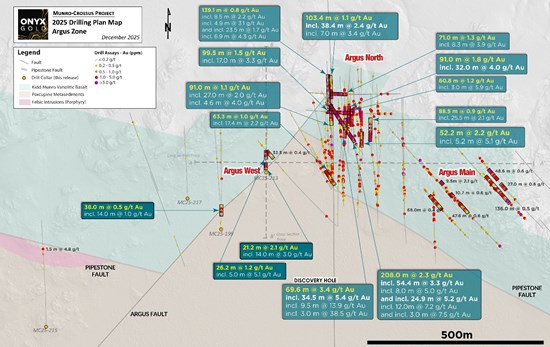 Results reported today from the new Argus West Zone include two (2) step-out diamond drill holes, MC25-213 and MC25-199, which were completed 250 m and 430 m, respectively, from Argus North Zone along the Argus Fault, a key northeast-southwest-trending, moderately to steeply dipping structure that appears to play an important role in the locus of gold mineralization.