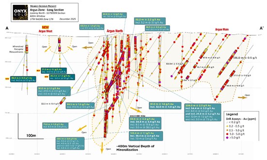 Figure 2 – Longitudinal Section Highlighting Argus North/Argus West Zone Drill Holes Reported in this Release