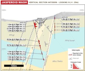 Gold mineralization at Jasperoid Wash extends from surface to 400 metres below surface and is hosted within altered feldspar porphyry dikes and adjacent conglomerates (Figure 11), like those at the Dark Star deposit.