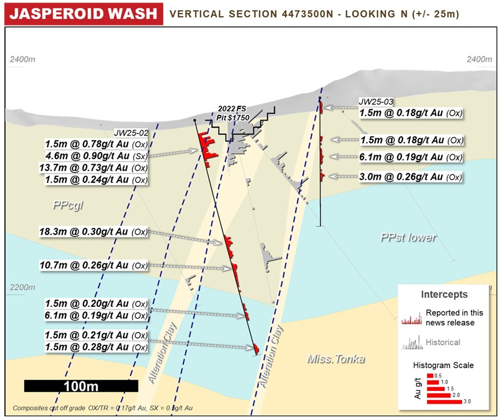 In 2025, drilling in the northeast area of the Pinion deposit (Figure 2) targeted the favorable stratigraphic breccia host where it is intersected by the Bullion Fault structure. Multiple holes intersected significant oxide mineralization 100-130 metres outside current pit margins (Figure 3) confirming that the Bullion Fault controls and hosts mineralization rather than terminating it. This reinterpretation opens significant expansion potential to the northeast.