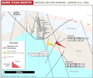 Drilling tested continuity of structurally controlled high-grade oxide gold shoots identified in 2024 (e.g. 25.9 metres at 3.2 g/t Au incl. 19.8 metres at 5.9 g/t Au in hole DR24-03 and 34.7 metres at 2.68 g/t Au incl. 13.6 metres at 5.85 g/t Au in DSC24-02.) Hole DS25-03 confirmed oxide mineralization between the north and south pit shells (Figure 4), with results indicating potential to extend the oxide envelope and support pit growth (Figure 5, 6). Downhole geophysics and follow-up drilling are planned for 2026 to define geometry and continuity.