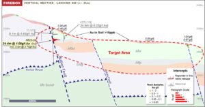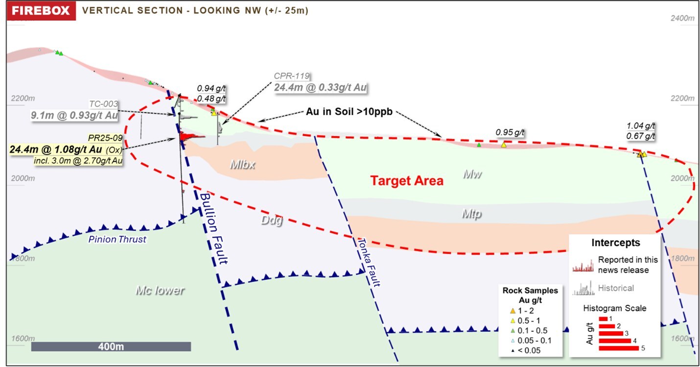 Located 500 metres northeast of the Pinion area, Firebox represents a new shallow oxide satellite opportunity (Figure 2, 7). The target was developed through integration of historical intercepts, recent mapping, gold-in-soil anomalies, and outcrop sampling. Mineralization style mirrors Pinion, with gold hosted in dissolution collapse breccia at the upper contact of Devils Gate limestone.