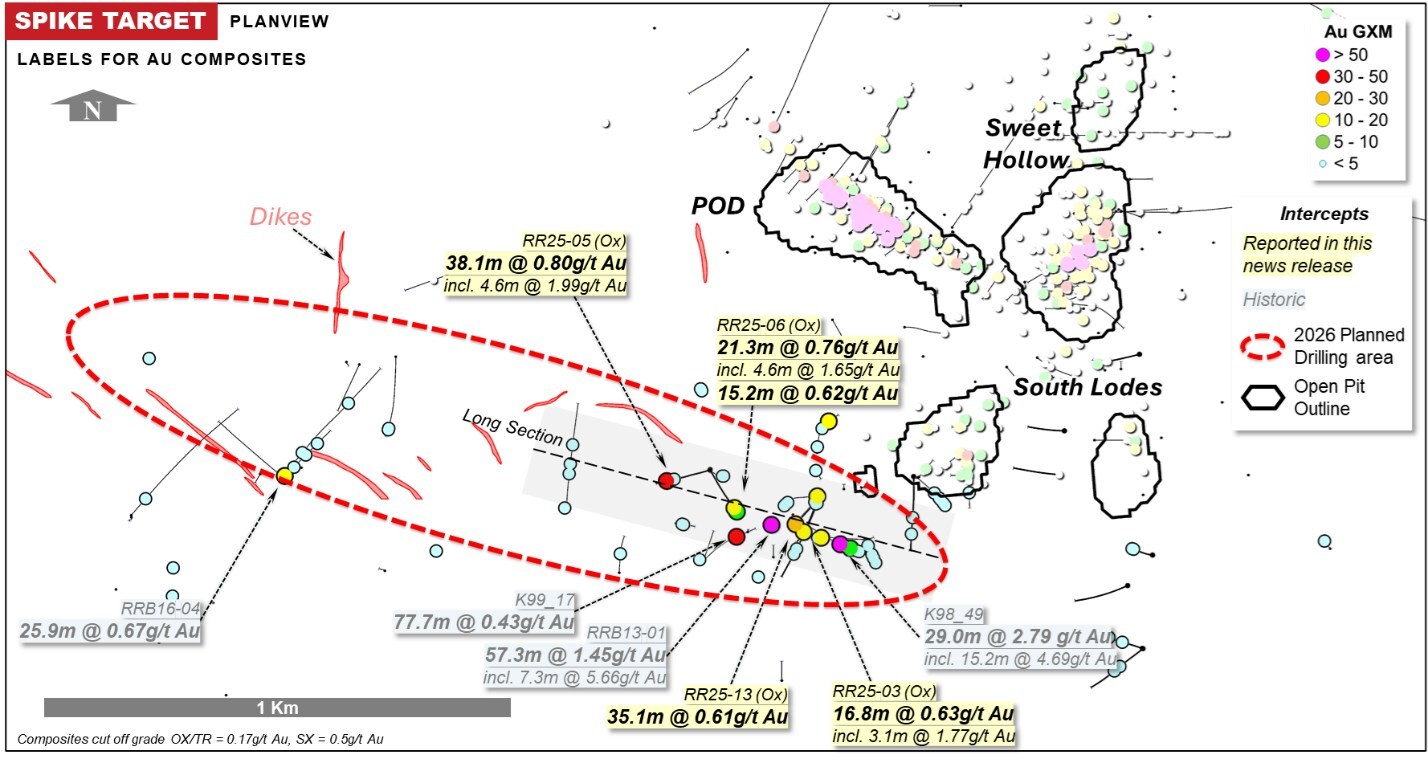 Spike is located 600 metres south of the POD-Sweet Hollow deposits (Figure 1) and shares similarities with Nevada Gold Mine’s Rain Deposit immediately north.