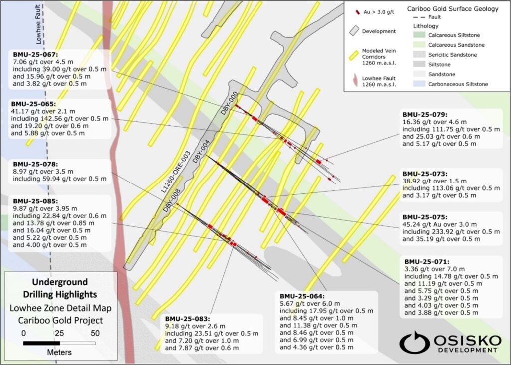 Osisko Development Corp. (NYSE: ODV) (TSX-V: ODV) is pleased to announce new infill drilling results from its ongoing 13,000-meter program on 10 meter drill spacing that commenced in August 2025 in the Lowhee Zone of the Company’s permitted, 100%-owned Cariboo Gold Project, located in central British Columbia, Canada. The first three fans of this program consisted of approximately 2,279 meters of underground infill drilling.
