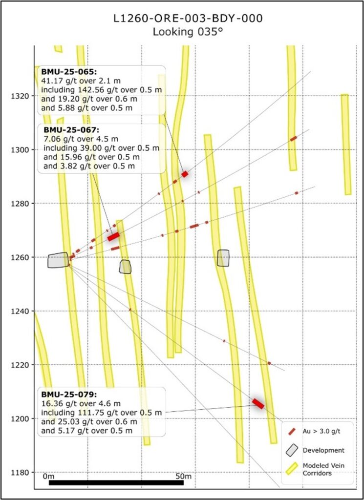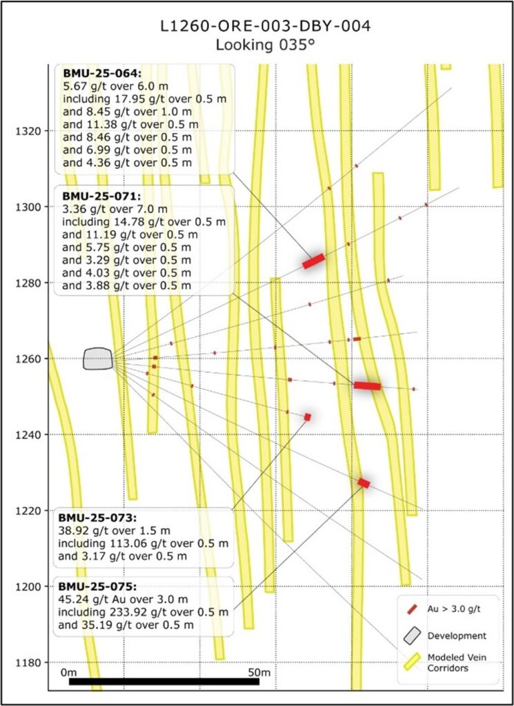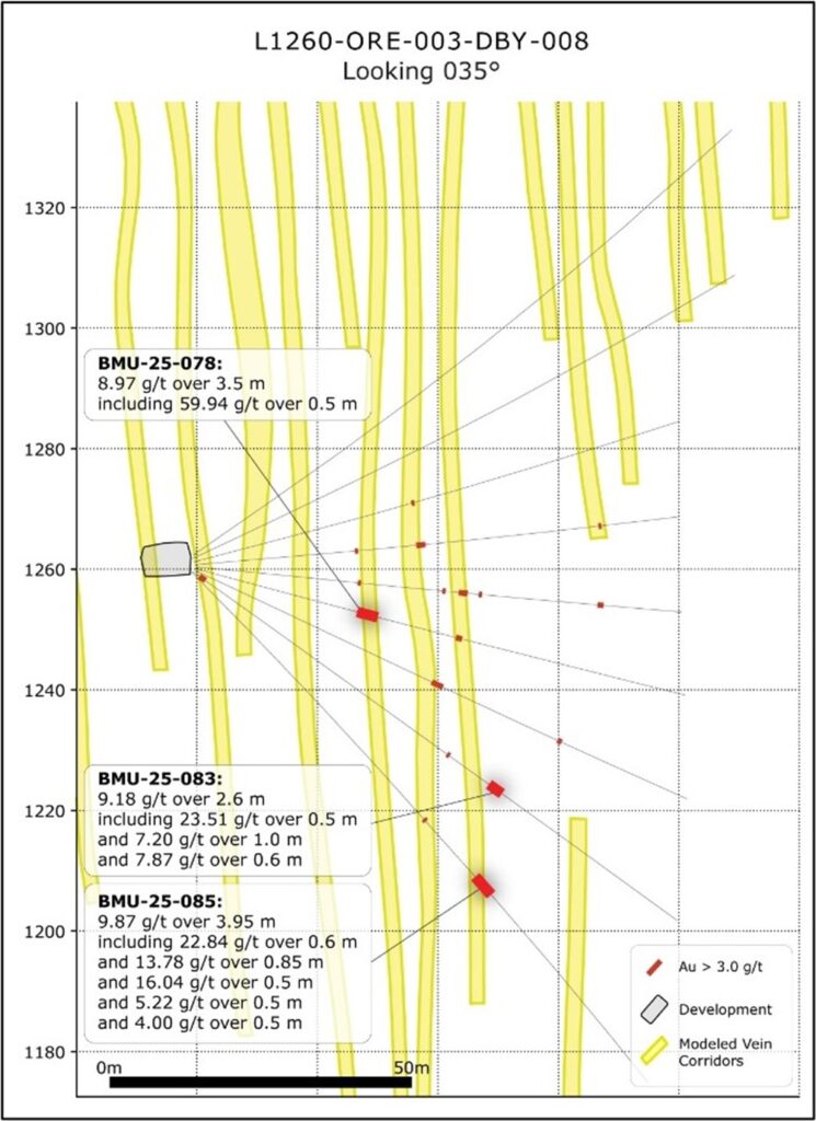 This news release includes assays from twenty-four (24) underground infill and exploration HQ diamond drill holes (63.5-millimeter diameter) totaling approximately 2,279 m completed from August 2025 through early September 2025 (see Table 1) and for which assays were received by October 1, 2025, with depths ranging from 54 to 114 m drilled on 3 fans at 40 m spaced fans (Figure 2). Select assay photon assay highlights include: