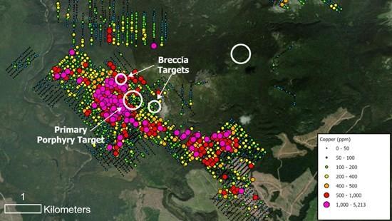 Figure 3 – A highly anomalous copper-in-soil anomaly defines the primary porphyry target at Trident. On a moderate slope, the source of the anomaly is most likely located near its upper extent — precisely where drilling is planned. This anomaly, combined with supporting geophysics and geology, makes Trident one of the most exciting undrilled porphyry copper-gold targets in British Columbia.