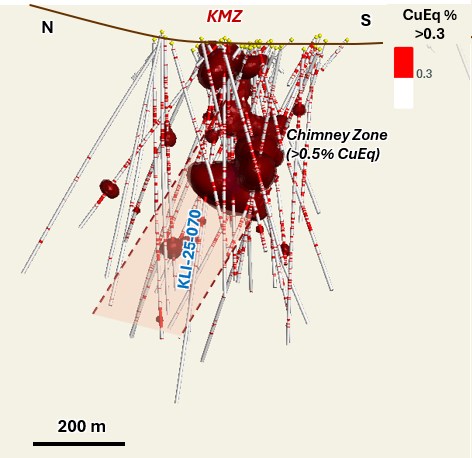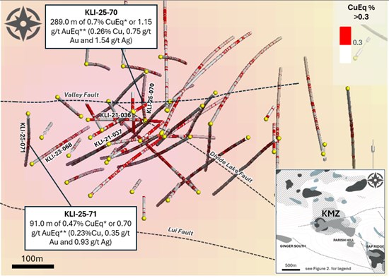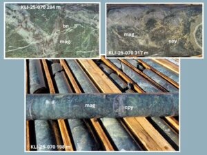 KLI-25-070, the first drill hole of the program, was collared south of the Valley Fault (Figure 4) and was designed to test an approximate 130 m gap in drilling north of strong copper-gold mineralization in holes KLI-21-036, which intersected 437 m of 0.64% CuEq* or 0.96 g/t AuEq* (0.22% copper, 0.60 g/t gold and 1.62 g/t silver) (see news release dated December 1, 2021) and KLI-21-037, which intersected 566.7 m of 0.51% CuEq* or 0.76 g/t AuEq** (0.20 % copper, 0.44 g/t gold, and 1.39 g/t silver) (see news release dated January 22, 2022). KLI-25-070 was collared from the same location as KLI-21-036 and drilled at an azimuth of 354o degrees and dip of 80o from an elevation of 1765 m to a depth of 786 m. The hole intersected chalcopyrite and bornite mineralization with quartz-magnetite veins and stockworks (Figure 6) and as disseminations, as well as chalcopyrite +/-bornite and pyrite mineralization associated with epidote and anhydrite veins.
