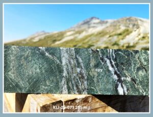 KLI-25-071 was collared west of KLI-23-068, which intersected 455.8 m of 0.43% CuEq* and 0.64 g/t AuEq**, and was designed to test for copper-gold mineralization extensions to the west within the mineral resource estimate pit shell at an azimuth of 180odegrees and dip of 75o from an elevation of 177 6m to a depth of 501 m. Chalcopyrite-pyrite mineralization occurs as disseminations with epidote-magnetite alteration, with quartz-sericite-chlorite veins, quartz-anhydrite veins and locally, quartz-magnetite veins (Figure 7).