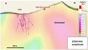 In addition to continued resource expansion drilling at KMZ, Pacific Ridge also plans to test a number of drill targets that occur along an underexplored 6-km mineralized trend, which include, from south to north, M39, Bap Ridge, Parish Hill, Ginger South and Ginger (see Figure 2). Further, the Company also plans on drill testing the Klip target, which is a new target identified in a 2024 ZTEM survey (see Figure 8). The Klip target is located north of KMZ and is named after a historical BC MINFILE occurrence (094D 185), the Klip Occurrence, located 400 m to the west. The Klip Occurrence records a NE-striking shear zone within QSP-altered volcaniclastic rocks. A one metre chip sample taken across the shear zone in 1985 yielded 3.8 g/t gold and 5.3 g/t silver. Pacific Ridge believes that drilling to date has only tested one part of the porphyry system and that most of the system remains hidden and untested to the north.