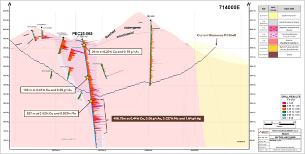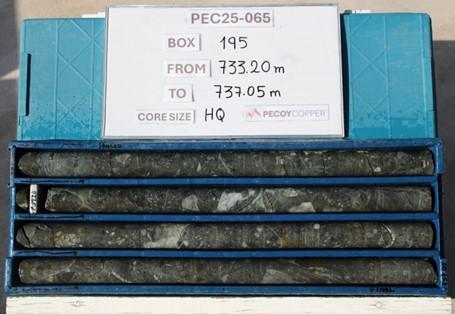 • Drillhole PEC-25-065 intersected 1,014 m at 0.37% Cu, 0.13 g/t Au, 1.33 g/t Ag and 0.015% Mo from 17 m depth