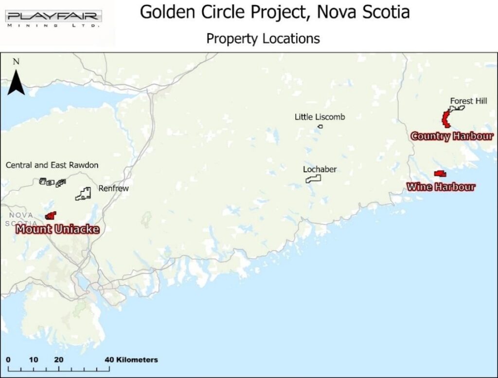 Playfair reviewed 1,400 assessment files for these properties to assess program scenarios for both high-grade and high-tonnage gold exploration. The opportunity at the Mount Uniacke property clearly stood out followed by priority prospects at Wine Harbour and Country Harbour.