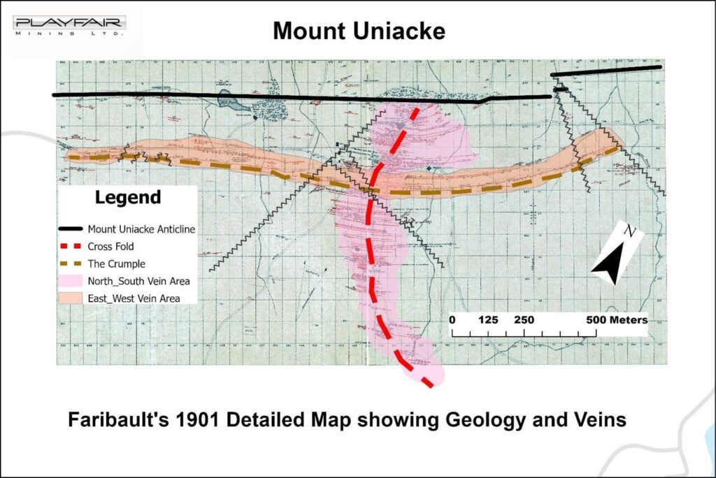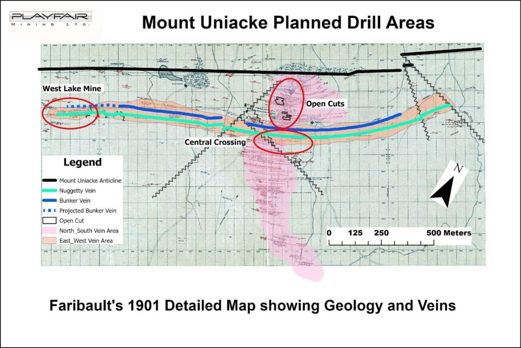 Playfair plans a targeted three-prong drill program to test the “Crumple” at modest depths below the shallow historical surface workings together with drill testing for bulk tonnage near historical large open cuts. The three areas selected by Playfair for drilling are shown below using Faribault’s 1901 map as a base.
