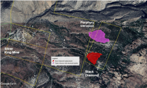Figure 1. Map showing the location of the Black Diamond replacement and felsic intrusion exploration targets at the Silver King project. Claim boundaries are shown in yellow.