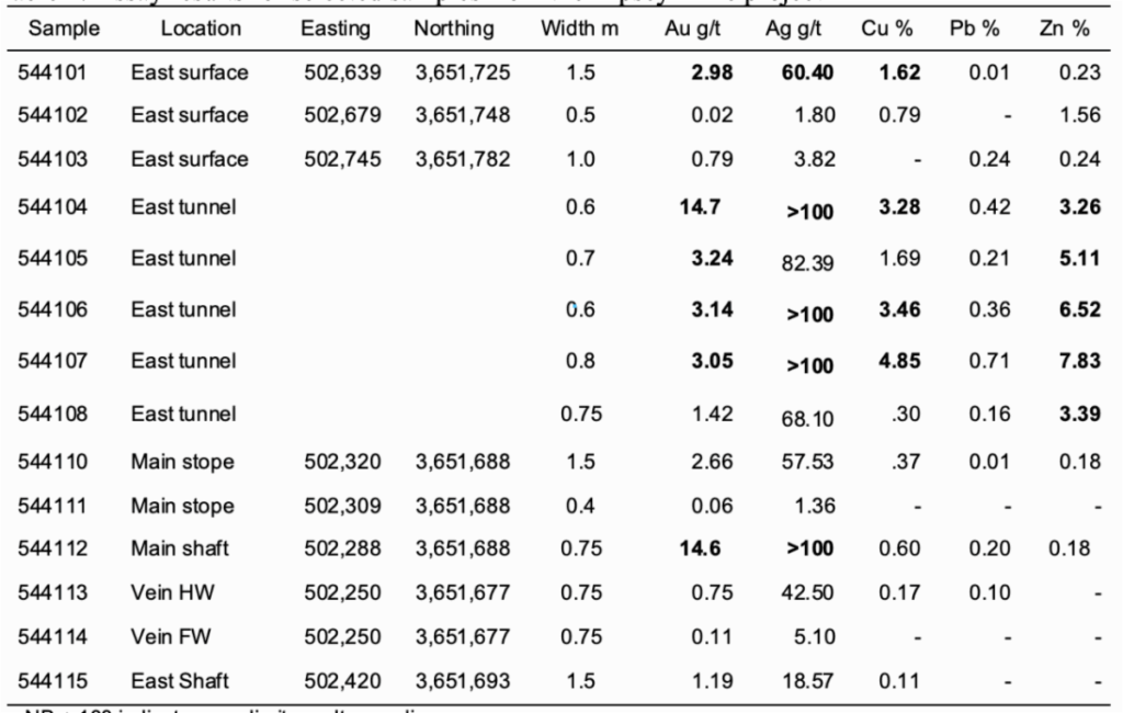 Table 1. Assay results for selected samples from the Ripsey Mine project