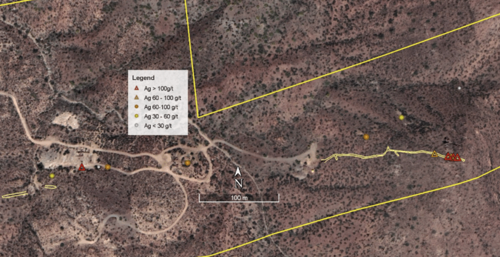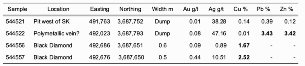 Samples from what appear to be the northward extension of the polymetallic vein east of the Silver King glory hole yielded 47 g/t Ag, 3.43 % Pb and 3.42 % Zn (Fig. 6). Also, an additional vein was identified in a small prospect about 100 meters southwest of the Silver King mine which returned anomalous values for silver and base metals.
