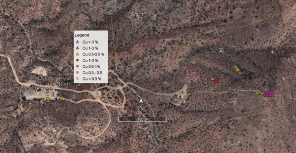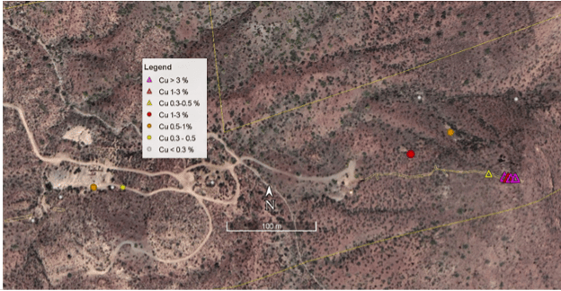 Figure 4. Map showing the Ripsey mine and Cu assays. Triangle symbols indicate samples taken from underground workings.