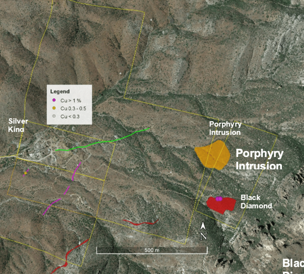 The mapping and sampling program at the Silver King project not only expanded the drill targets with the identification of two additional veins and zones of replacement mineralization but also identified a felsic intrusion with strong sericite alteration and moderate to strong stockwork of quartz-pyrite veins near the Black Diamond replacement body. This porphyry intrusion is exposed within an erosional window inside a widespread and less altered quartz diorite intrusion and may represent the upper portions of a porphyry system. This area was explored by Fischer-Watt Mining Co. in 1980 and 19811. Fischer-Watt geologists concluded that the strongly quartz-sericite-pyrite body was probably related to the upper parts of a porphyry system based on rock geochemistry showing copper, molybdenum and zinc anomalies centered on the body, the alteration assemblages present, and the presence of high salinity fluid inclusions in the stockwork quartz veins.