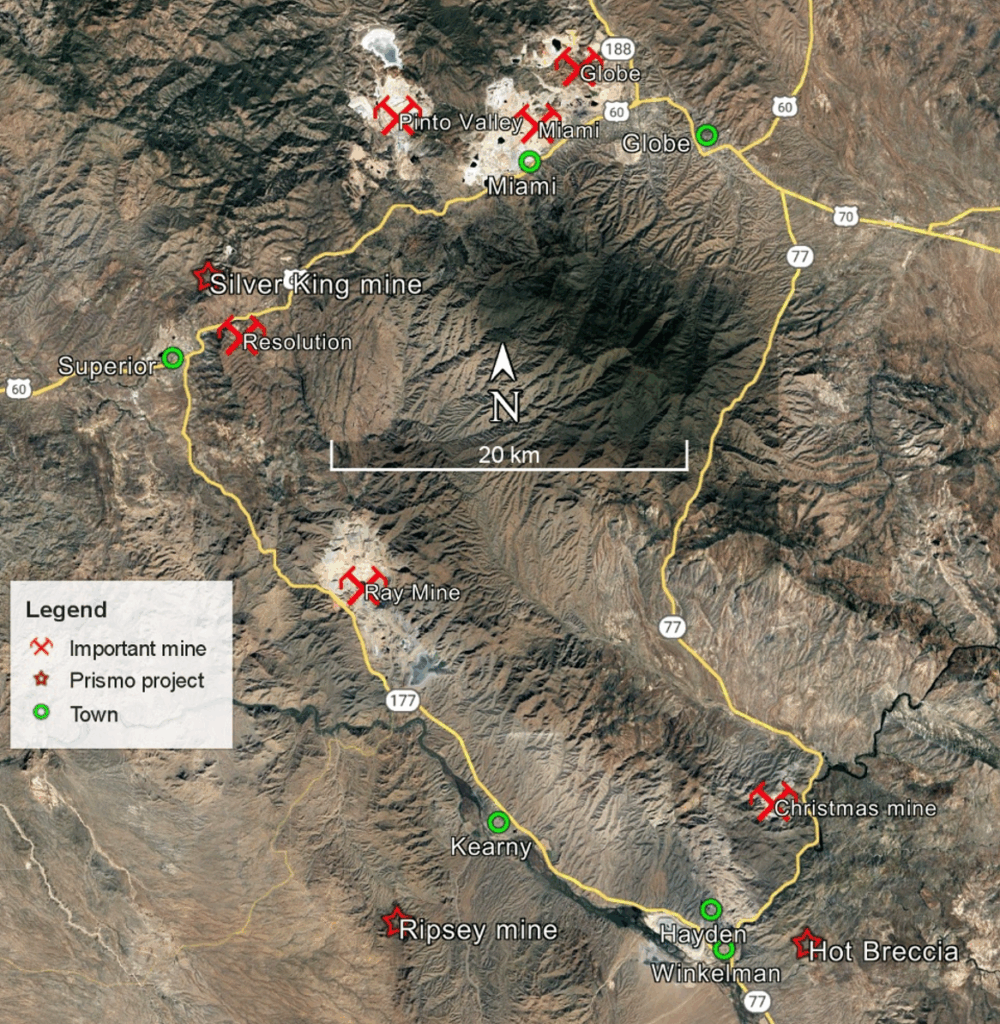 Figure 7. Location map for the Ripsey mine in the Arizona Copper Belt. The project is located about 20 km west of the Company’s Hot Breccia deposit and about 40 km southeast of the Silver King mine.