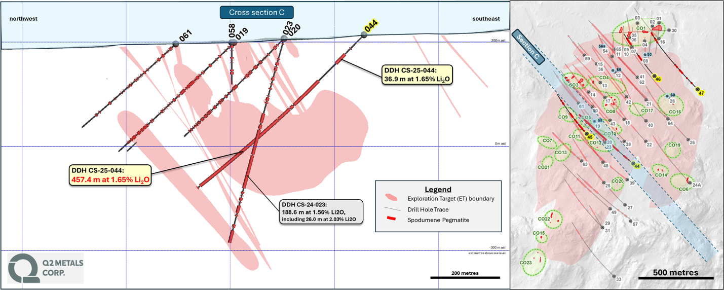 • Drill hole CS25-044 is the widest continuous spodumene pegmatite interval drilled by Q2 to date.