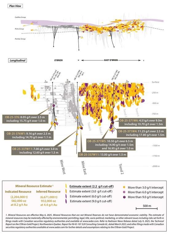 Matt Manson, President & CEO, commented: “Today’s drill results illustrate the extension of classic, high-grade O’Brien gold mineralization across a broad front. We are reporting the first high-grade intercepts beneath the western portion of the historic mine, with drill hole OB-25-376W1 extending mineralization 160 metres below the former mine in this area. Drill hole OB-24-337W11 demonstrates continuity of high-grade mineralization below the main stope of the historic mine. Of particular note, drill holes OB-25-371W4 to W6 returned high-grade mineralization on the western edge of the deep extension of Trend #2, close to the observed extension of Trend #1 (Figures 1&2). This suggests that the apparent gap between these two trends is a function of drill coverage rather than geology, as we have suspected. Closing this gap with new drilling is a priority. With a fully-funded 140,000-metre drill program ongoing and an increase in rigs from the current four to an eventual eight, we are casting a wide net at O’Brien and seeing consistent success.”
