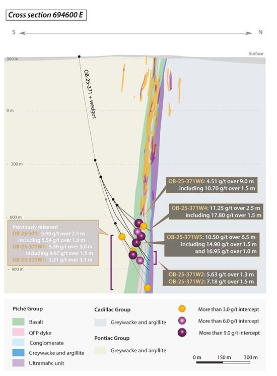 Today’s results also include the first drill holes located below the western portion of the historic O’Brien Gold Mine, designated “O’Brien Mine West”. As with the main mining area, no exploration had been conducted below O’Brien Mine West since operations ended in 1957. From pilot hole OB-25-376 and wedge branches W1 to W5, five holes returned intercepts with grades and thicknesses consistent with the Project’s mineral resources, including OB-25-376W1, which intersected 9.16 g/t Au over 2.5 metres, including 14.70 g/t Au over 1.1 metres (Figure 1). This now extends gold mineralization at O’Brien Mine West 160 metres below the base of the former mine workings (Figure 4).