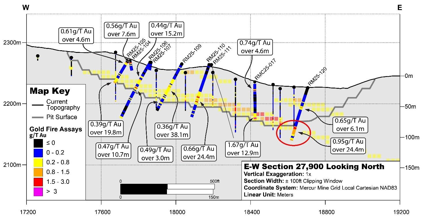 Revival Gold has completed 100 holes and about 10,000 meters of this year’s planned 13,000-meter drilling program. Figure 1 describes drill hole locations for the eleven holes released today. Figure 2 is a cross section through the Rover area at Main Mercur with drilling intercepts and resource blocks in the background. The figure shows broad alignment of this year’s drilling intercepts to the PEA block model. The figure further highlights the intercept of oxidized mineralization in RM25-120 showing resource expansion potential down-dip from the PEA pit shell.