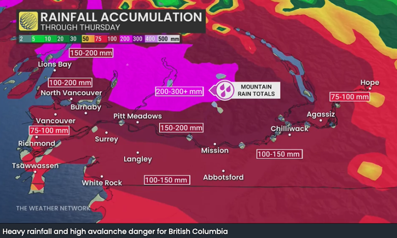 Northern and western Vancouver Island and the Central Coast are under flood watch. Areas expected to receive the most rain include Tofino/western Vancouver Island (200-400mm), the North Shore mountains (150-200+mm) and Squamish (150-200mm).