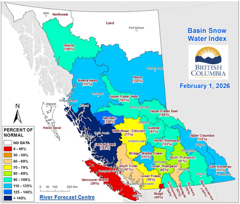 As of mid-February, Vancouver Island’s snow pack is the lowest at 69% of normal, followed by the Skagit region at 49% and the South Coast at 61%.