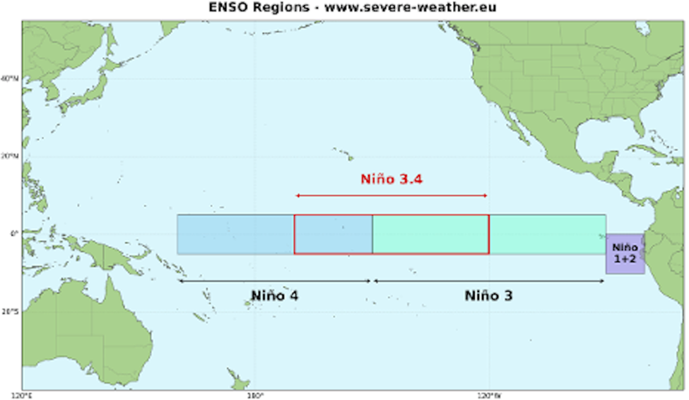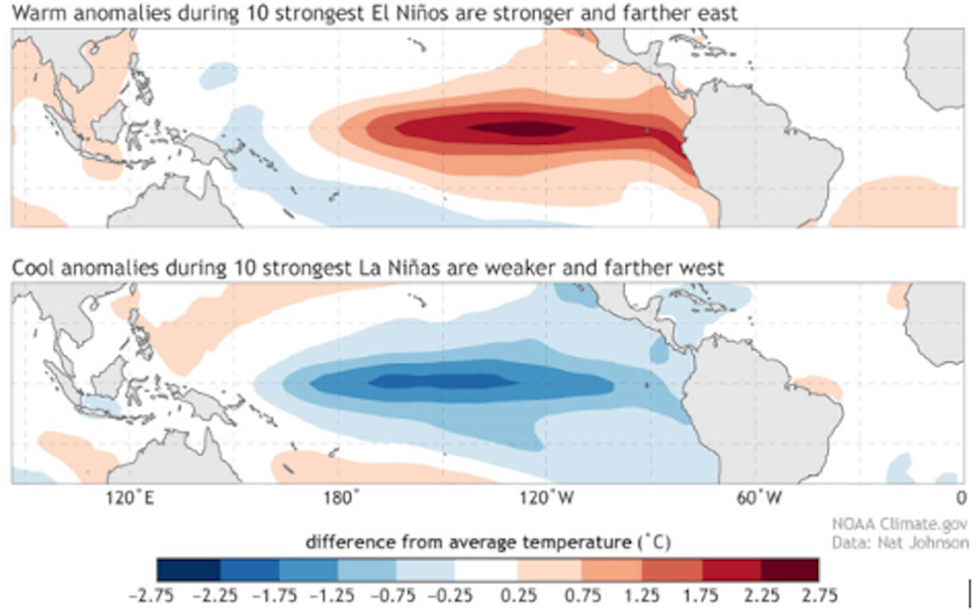 A Washington Post article states that the abnormal sea surface warmth and storms it brings to the central and eastern Pacific Ocean, leads to drought in other parts of the world including southeast Asia and southern Africa.